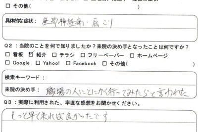 当院を知る前、どんなことで悩んでいましたか? 腰の痛み 具体的な症状:坐骨神経痛、肩こり 当院のことを何で知りましたか?来院の決め手となったことは何ですか? 紹介 来院の決め手:職場の人に、とにかく...